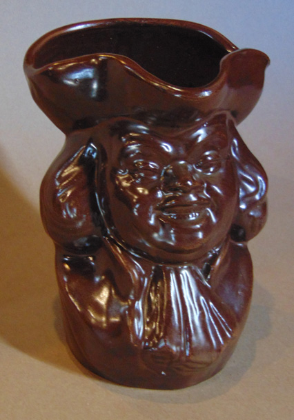 Today’s illustration shows a character jug. Character jugs are an offshoot of the Toby jugs. The origin of the name Toby jug, we don’t know, but the jug is definitely related to the drinking of ale. Toby jugs are made in the shape of the full body of a person, most often seated, character jugs are only the head or head and shoulders of a person. Character jugs are valued for their originality of design, although most of them depict a character from the 18th or 19th century. The color brown was used only occasionally by the Dorchester Pottery, so the item in the illustration is fairly rare. The same design was produced in yellow.